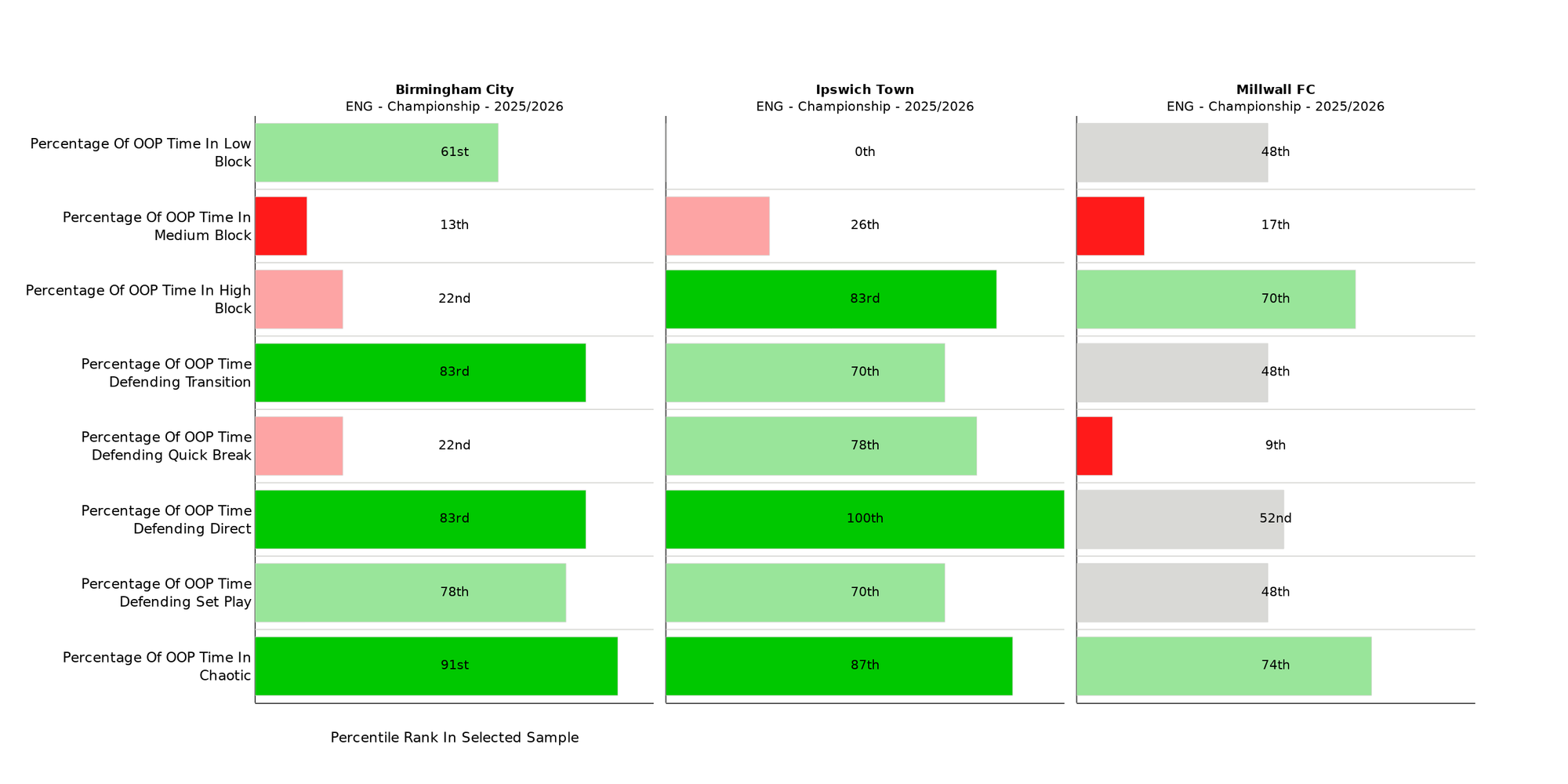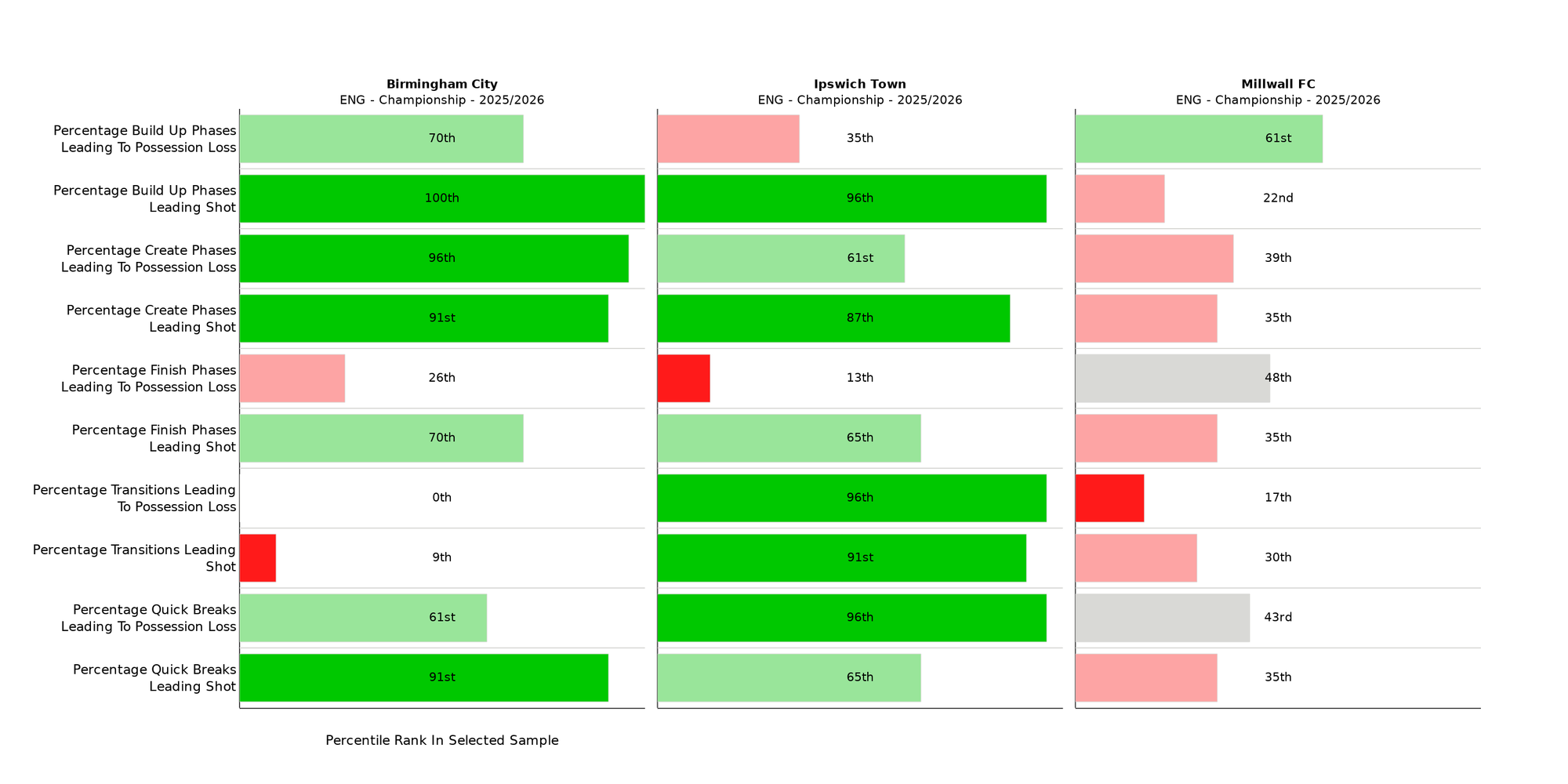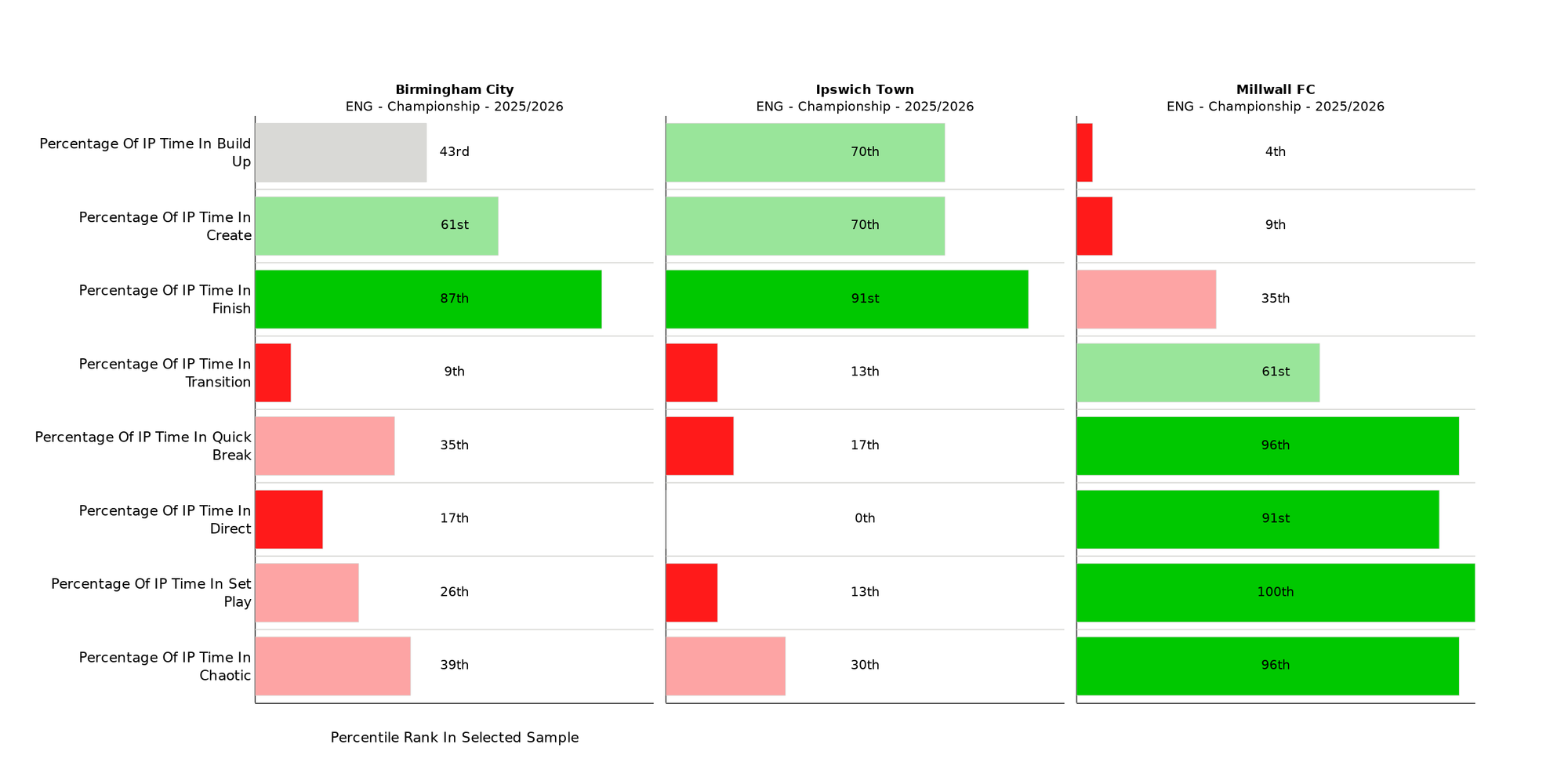 Millwall rank first for percentage of IP time in Set Play and second for Quick Break and Chaotic phases. The Lions live for the second-ball, Ipswich and Birmingham are more controlled and more patient. In general, possession-orientated sides spend a larger majority of time in all three phases; the most dominant teams will be outliers for Percentage of Time in Create and Finish.