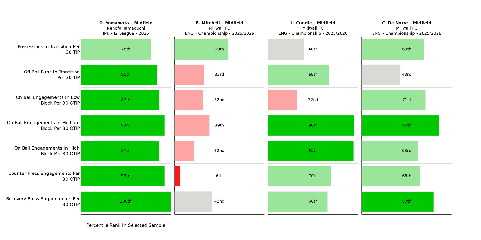 In terms of his stylistic fit to Millwall, his outlying IP Phase is Transition - that matches our search for a player that is used to transforming turnovers into attacks. Yamamoto is also a top 15% Midfielder for On Ball Engagements (OBE) in Low, Medium and High Block as well as for all OBE Types. He should be able to pick up Millwall’s pressing habits.