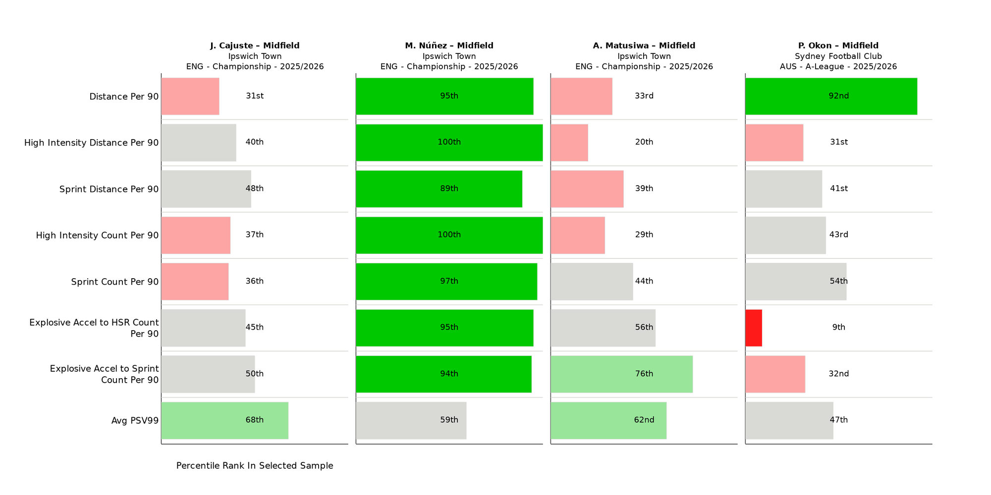 When compared to Midfielders across all leagues, only Léo Scienza - a successful summer recruit for Southampton - ranks above him for Carries at Speed per 30 TIP; these two are the only players that average 10+ Per 90. For High Intensity Count per 90, only Marcelino Núñez and Takaya Kimura rank above him.