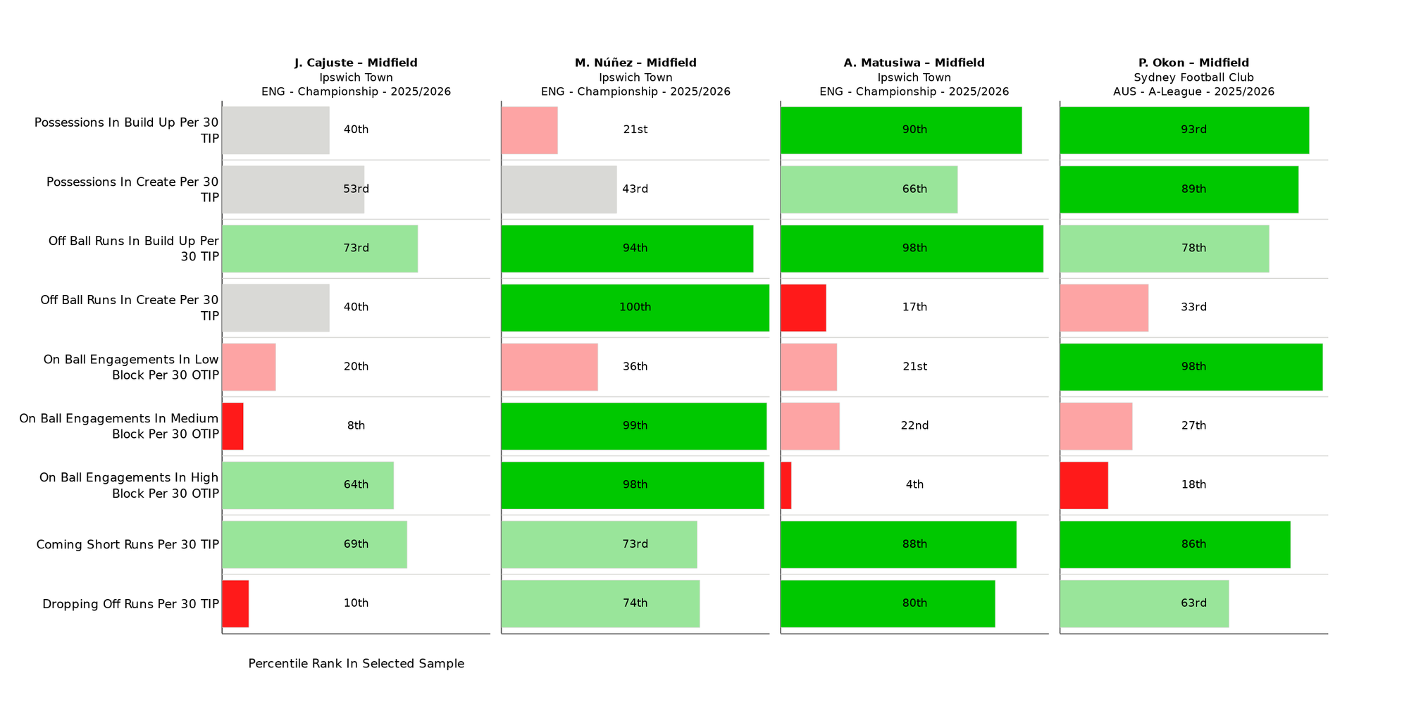 He’s also operating in a relatively similar environment to the one he’ll find at Ipswich. He ranks first among Midfielders for OBEs in Low Block Per 30 OTIP, which could boost their efficiency at disrupting opposition attacks in that shape. But, more importantly, he also ranks first for Recovery Press Engagements Per 30 OTIP - which highlights a familiarity with chasing back after turnovers.